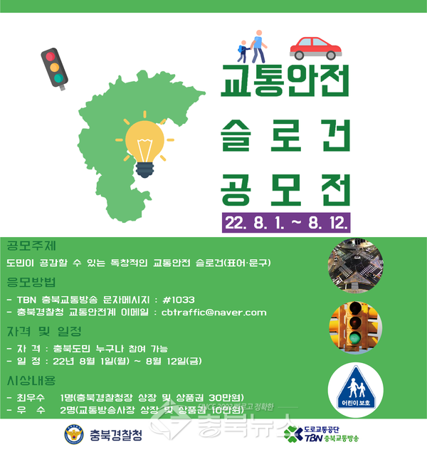 충북경찰청과 TBN충북교통방송 합동으로 개최하는 공모전 주제는 교통안전 관련 20자 안팎의 슬로건(표어·문구)이다.