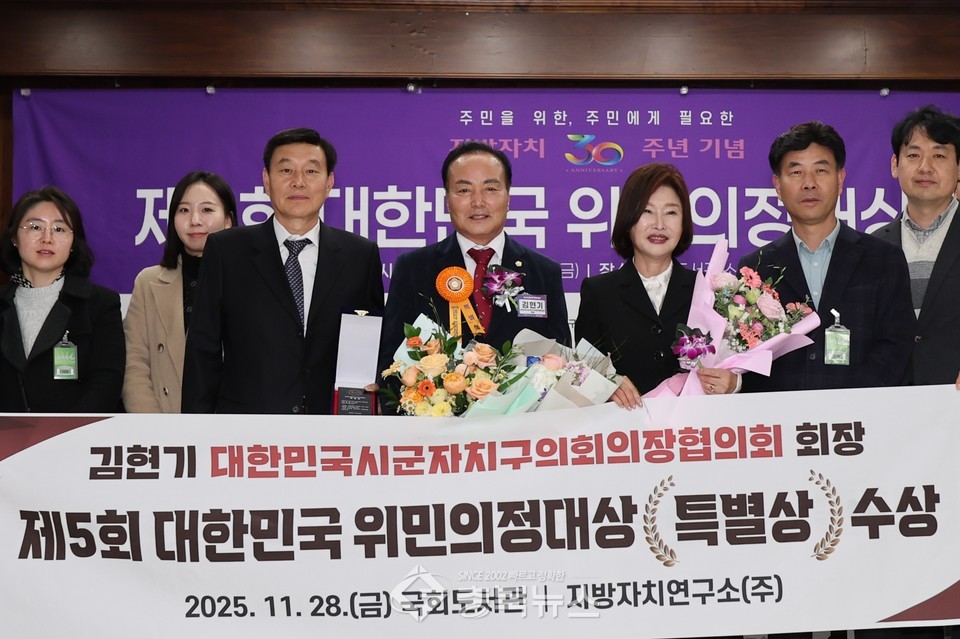 (충북뉴스 양정아 기자) 대한민국시군자치구의회의장협의회 회장인 김현기 청주시의회 의장이 28일 서울 국회도서관 소강당에서 열린 ‘제5회 대한민국 위민의정대상’ 시상식에서 특별상을 수상했다. 지방의회 위상 강화와 지방자치 발전에 기여한 공로가 인정된 결과다.