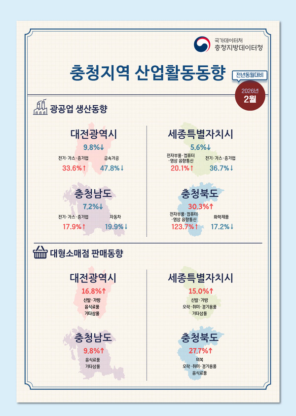 31일 국가데이터처 충청지방데이터청이 발표한 '2026년 2월 충청지역 산업활동동향'에 따르면 충북 광공업 생산 급증을 이끈 것은 전자부품·컴퓨터·영상 음향통신 부문으로, 전년 동월 대비 123.7% 증가하며 폭발적인 성장세를 보였다.