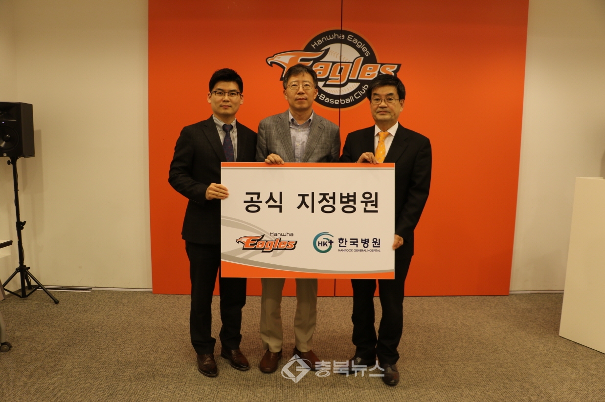 28일 한국병원에 따르면 박정규 한화이글스 단장과 박춘섭 한국병원 대외협력이사, 송준오 한국병원 기획실장은 이날 대전 한화생명 이글스 파크에서 청주지역 공식 지정병원 제휴 협약식을 가졌다.