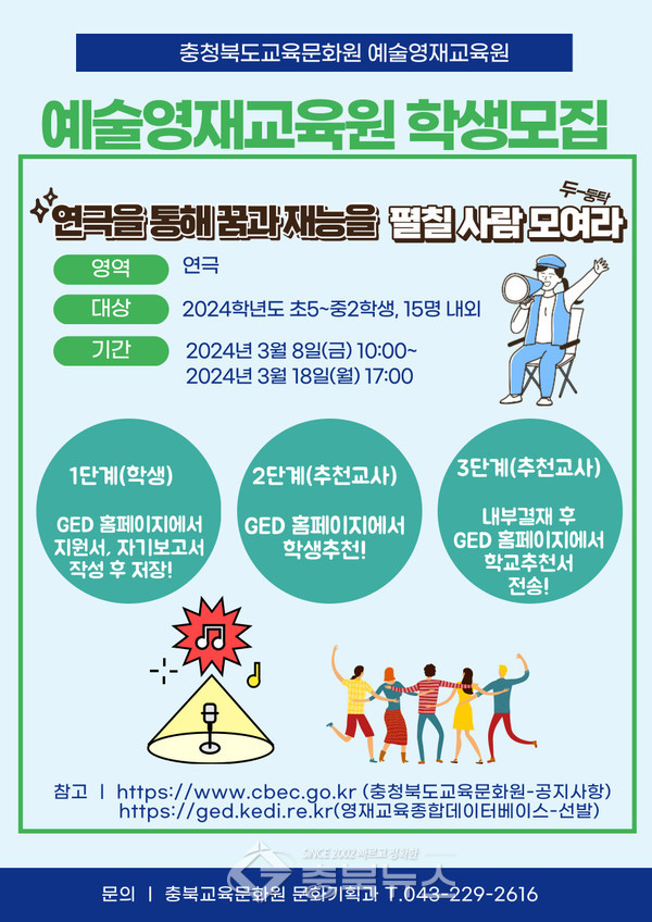 (충북뉴스 곽근만 기자) 충북교육문화원 부설예술영재교육원은 연극을 통해 꿈과 재능을 펼치고 싶은 학생들을 모집한다고 6일 밝혔다.