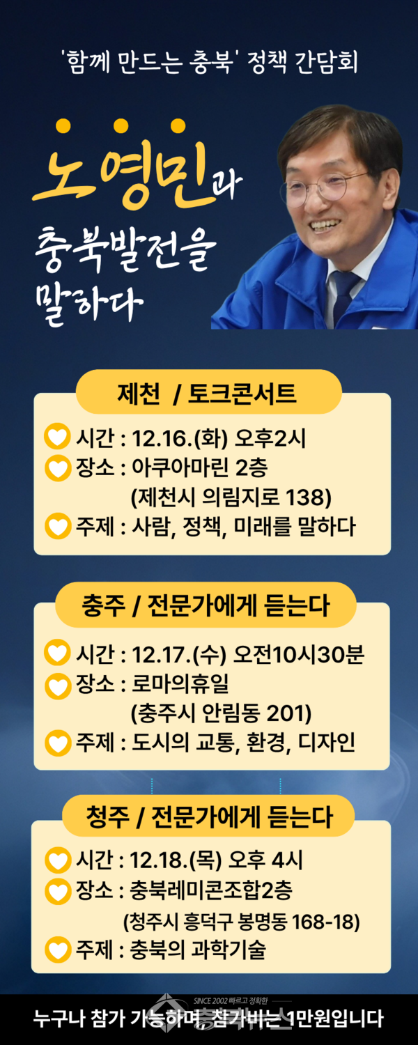 제천 간담회는 16일 오후 2시 ‘사람·정책·미래를 말하다’를 주제로 토크콘서트 형식으로 열리며, 시민들과 지역 발전 과제를 논의한다. 17일 충주에서는 ‘노영민과 함께 충주권 전문가들에게 듣는다’를 주제로 교통·환경 등 도시 현안을 중심으로 전문가 토론이 진행된다.